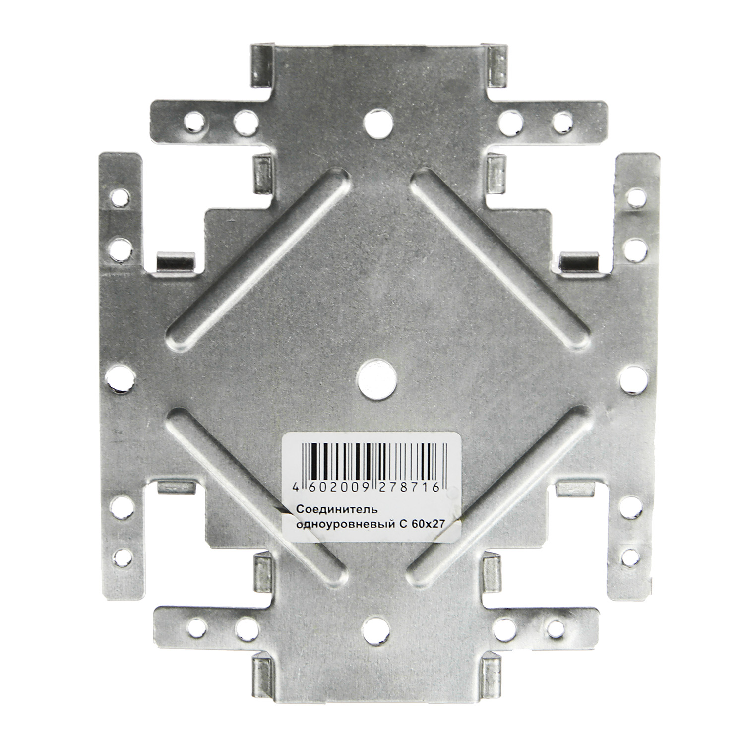 Предназначен для крестообразного соединения потолочных конструкций на одном уровне и во взаимно перпендикулярных направлениях. Применяется для крепления несущих отрезков потолочного профиля к базовому. Используется с профилем ПП 60х27.
