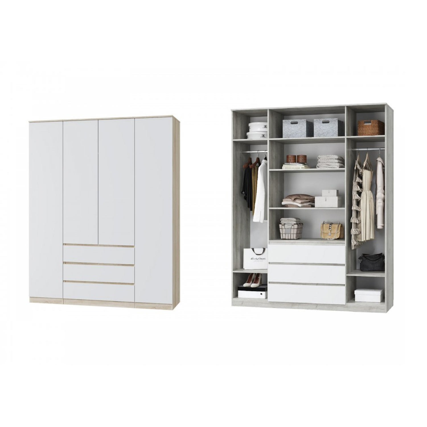 Шкаф для одежды 1802х2273х577 мм 33 КОМОДА Лори, с четырьмя дверцами, с тремя ящиками, дуб сонома светлый / белый