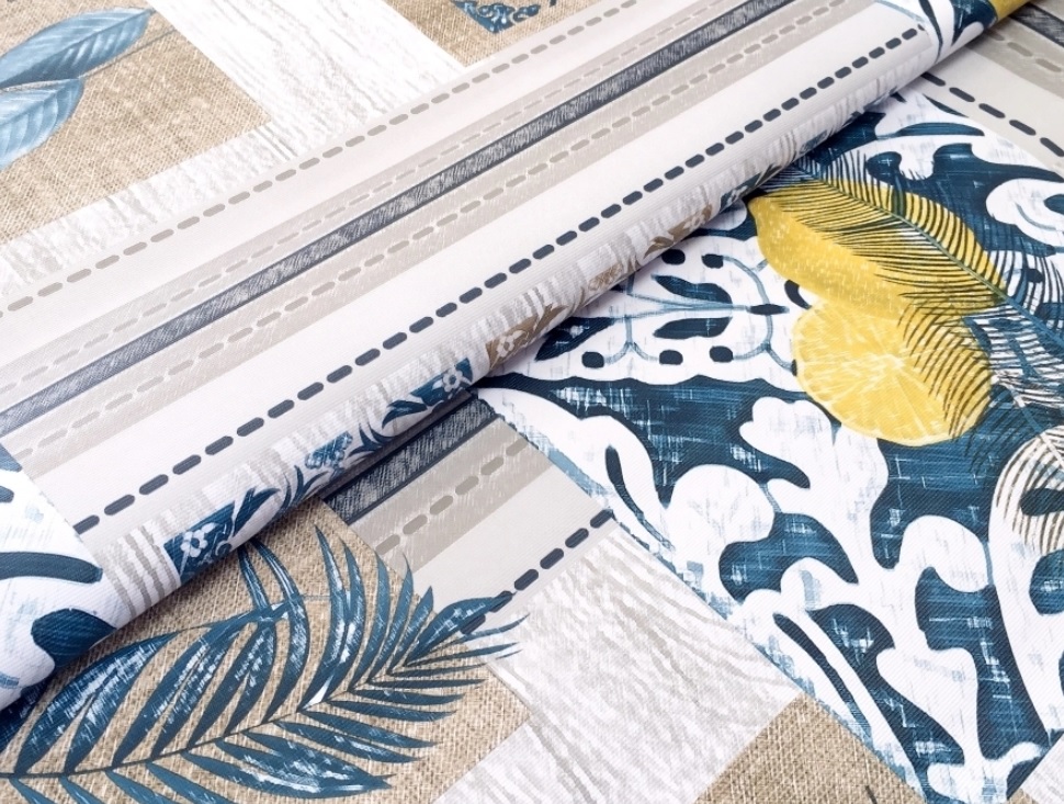 Клеёнка на тканевой основе "Print" "Лимоны, листья" син.-бежевый. шир.1,37м GW-21400 "Great Way" *20