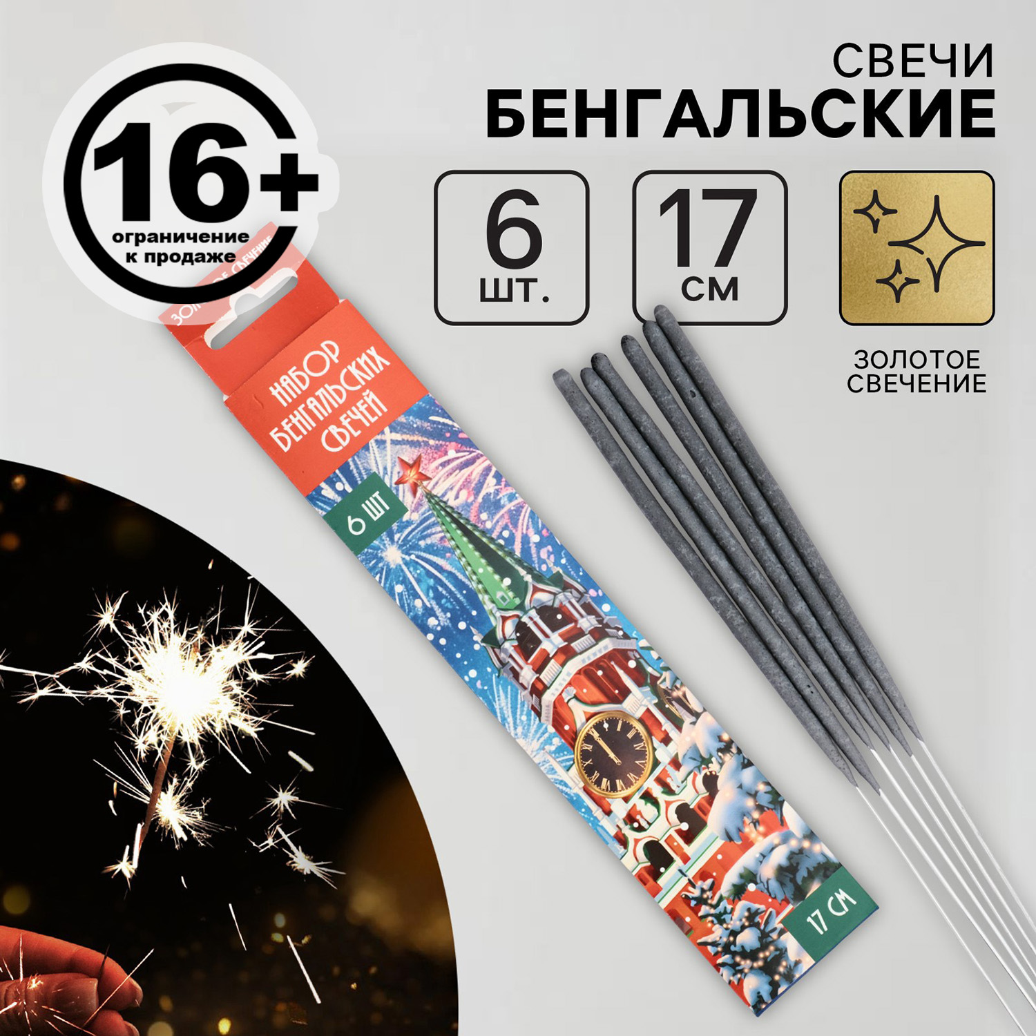 Бенгальские огни 17 см, 6 шт., золотое свечение, горение 30 сек. 10329352